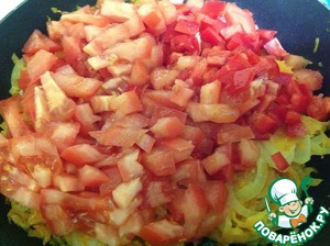 Помидор и болгарский перец режем средними кубиками и отправляем тушиться к моркови и луку на 5-7 мин.