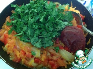 Добавляем рубленую зелень, 2 ст. л. томат-пасты, соль по вкусу, 1 ч. л. сахара и 1 ст. л. уксуса, перемешиваем, добавляем стакан кипяченой воды