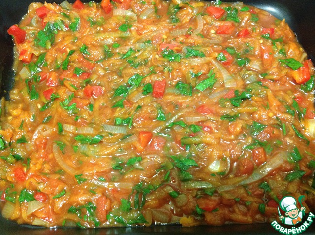 • Сверху выкладываем остатки соуса и отправляем в духовку на 20 мин.