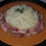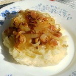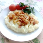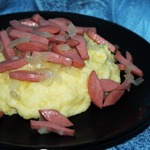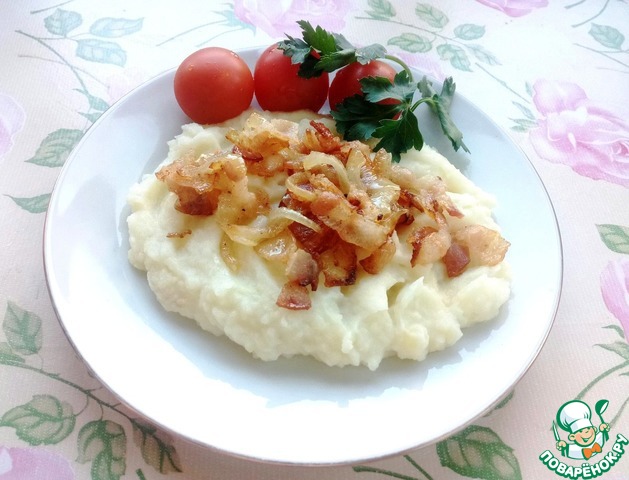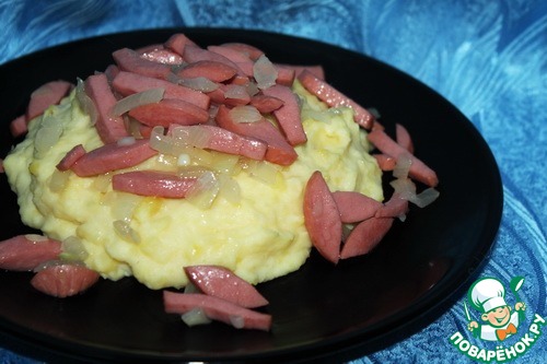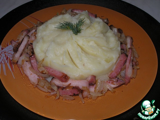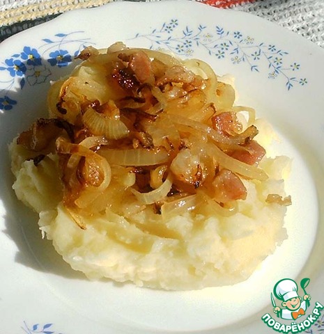 Не забыли еще про лук с беконом? Так вот, выкладываем пюре и сверху щедро украшаем зажаркой. Для кого-то это уже полноценное блюдо, а мы еще сосисок отварили :)
