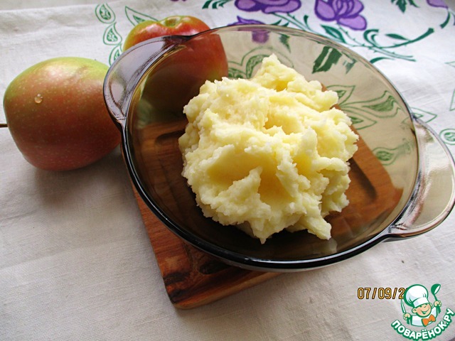 Когда картошка доварится, сливаем с нее воду (часть воды слить в чашечку - еще пригодится). Добавляем туда же обжаренные яблоки и начинаем толочь :) У меня толкушки нет, пришлось вилкой : ( Можно, конечно, и с помощью блендера, но мне так ну совсем не нравится...
