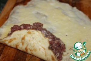 На готовый яичный блин выкладываем немного фарша и закручиваем (как голубцы)