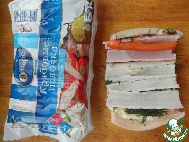 Отварить в подсоленной воде кальмары (от момента закипания воды варить 1 минуту, затем закрыть крышкой и оставить в кипятке на 20 минут). Слить воду и остудить. Этот способ варки кальмаров делает их очень нежными. Обрезать прямоугольником чуть большим, чем развернутая крабовая палочка, тушку кальмара. Кальмар промазать плавленым сыром и посыпать укропом. Сверху выложить развернутую крабовую палочку, на нее полоску болгарского перца.