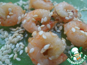 Креветки обжарить в масле с солью и перцем, обвалять в кунжутных семечках.