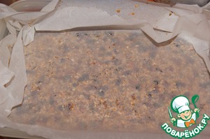 Емкость с бортиками и размером 32х22 застелить пекарской бумагой так, чтобы она покрывала и борта, и поместить в нее орехово-карамельную смесь. Разровнять.
