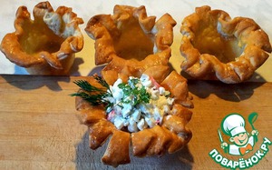 Днём раньше для этого салата я испекла корзиночки из слоёного теста. Тесто делала на подсолнечном масле, не на сливочном.