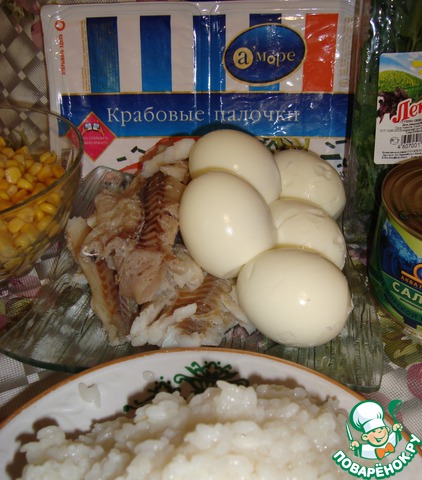 Вот продукты, которые нам понадобятся для нашего салата! Рис, рыбу, яйца отвариваем заранее.