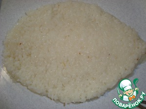 Начинаем собирать нашу рыбку на широком блюде слоями. Первый слой рис, придаем форму рыбы.
