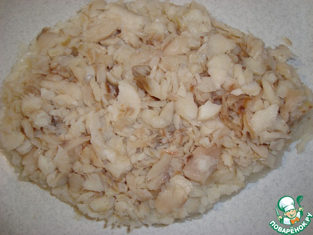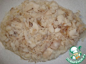 Следующий слой рыба, я взяла филе трески. Разбираем ее на волокна руками.