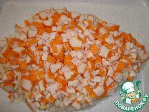 На четыре части нарезаем крабовые палочки, и это будет наш следующий слой.