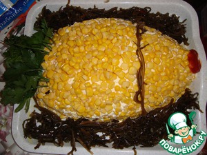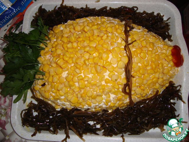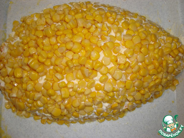 Завершающий наш слой - это кукуруза. Разравниваем ее по всей поверхности нашей рыбки, вот теперь она точно стала золотой!