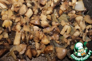 • Далее займемся грибами. Мелко нарежем лук и грибы. Обжарим их на сливочном масле около 5 мин.