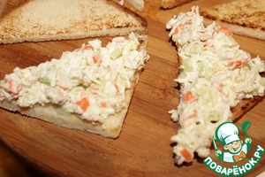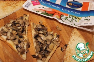 • И выложим аккуратно грибы на хлеб. В той же сковородке обжарим (3 мин.) нарезанные крабовые палочки. И выложим сверху на грибы.