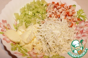 • Огурцы очистить от кожицы и мелко нарезать кубиками. Крабовые палочки тоже мелко нарезать. Яйцо натереть на мелкой терке. Добавить сыр, чуть посолить и все перемешать.