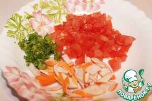 • И последняя начинка. Помидоры без семян нарезать, добавить к ним измельченную зелень петрушки и нарезанные крабовые палочки, посолить, сбрызнуть оливковым маслом при желании уксусом.