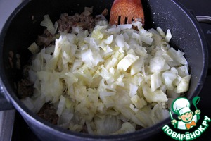 К обжаренным овощам добавить говяжий (или другой НЕжирный) фарш и готовить на сильном огне, разминая комочки мяса.
