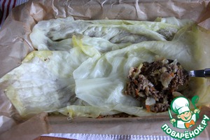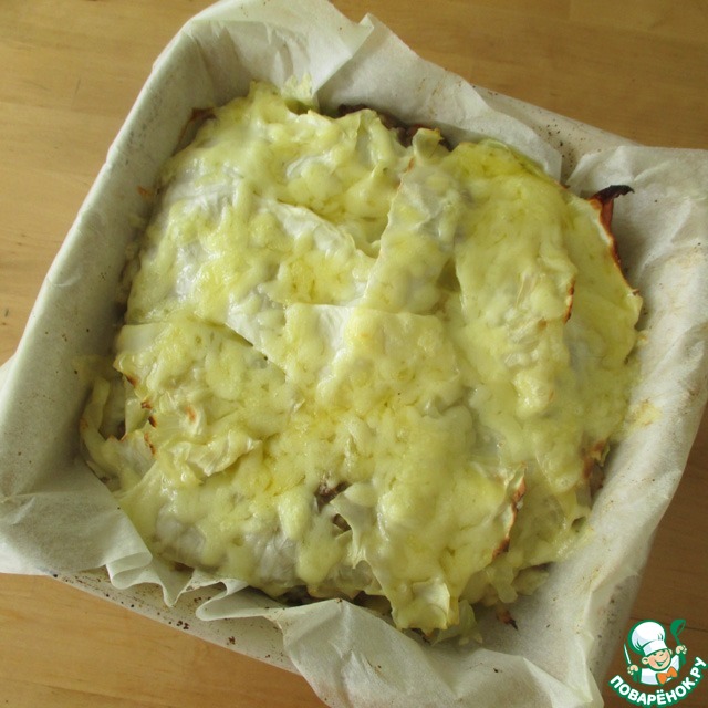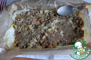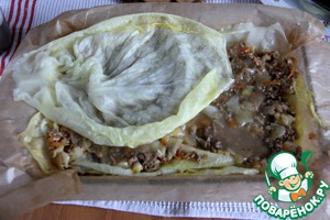 Форму для выпечки застелить пергаментом (бумагой для выпечки), выложить слой капустных листов, а сверху - мясную начинку, -