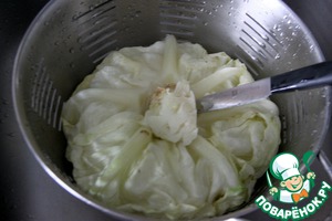 Капусту отварить или приготовить в СВЧ, до мягкости. Вырезать кочерыжку, отделить верхние листья.
