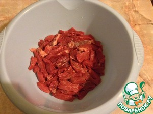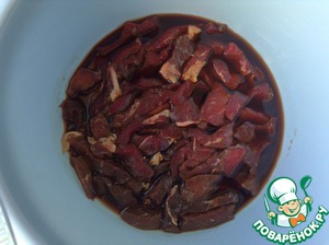 Говядину замариновать в соевом соусе. Время маринования 3-4 часа, но лучше на ночь.