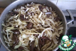 Доводим мясо до полуготовности и добавляем лук...