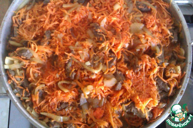 Как только лук станет полупрозрачным, добавляем морковь и, при необходимости, воду - для поддержания тушения.