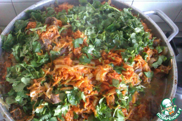 Добавляем чеснок и кинзу, тушим еще 3-4 минуты...