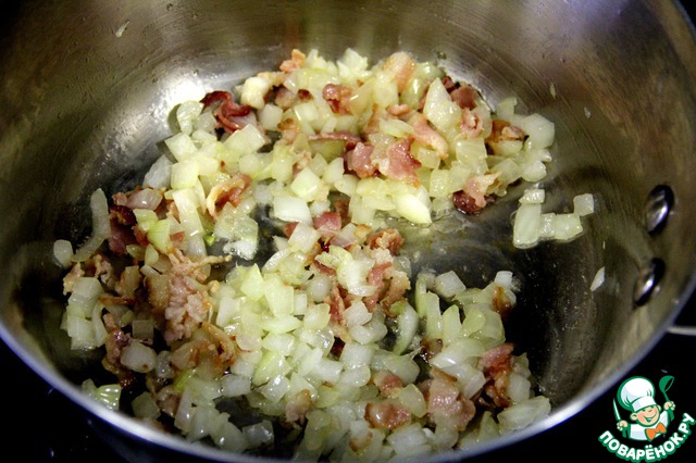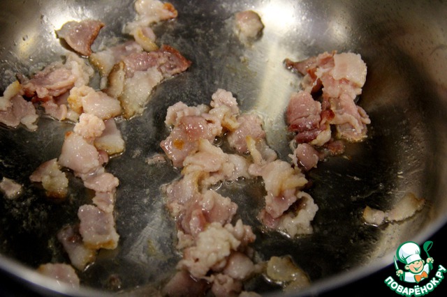 Бекон нарезать кубиками и слегка обжарить в кастрюле с толстым дном, минуты 3-4. Весь жир должен вытечь.