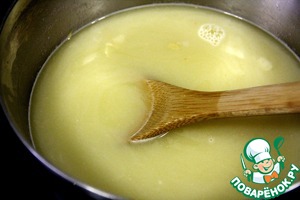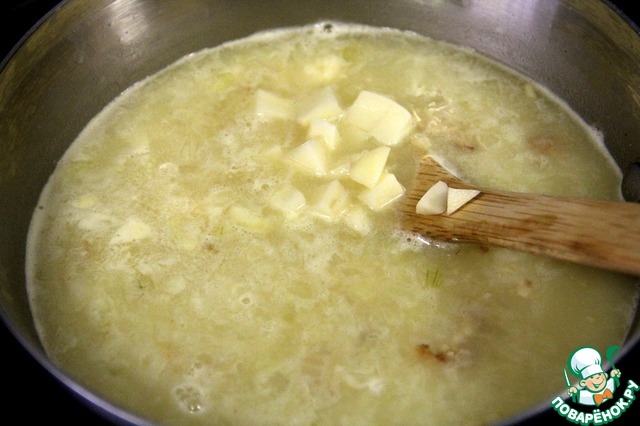 Картофель нарезать на кубики и добавить в кастрюлю. Готовить до готовности картофеля на очень медленном огне, около 15 минут.