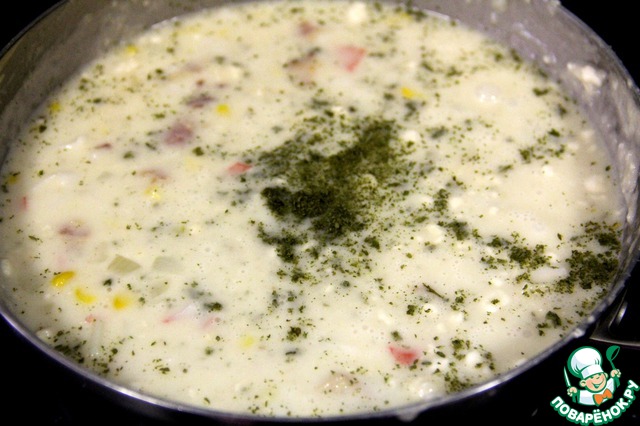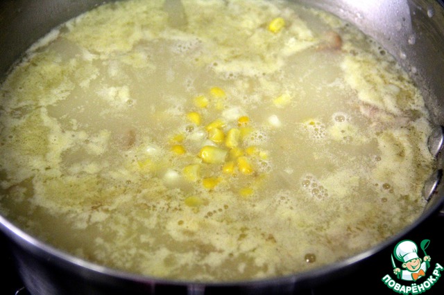 Добавить кукурузные зерна. Готовить на очень медленном огне около 1 минуты.