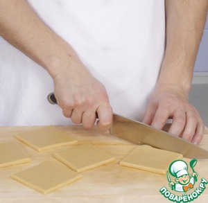 Раскатать тесто в тонкий пласт и нарезать на квадраты со стороной 8 см.