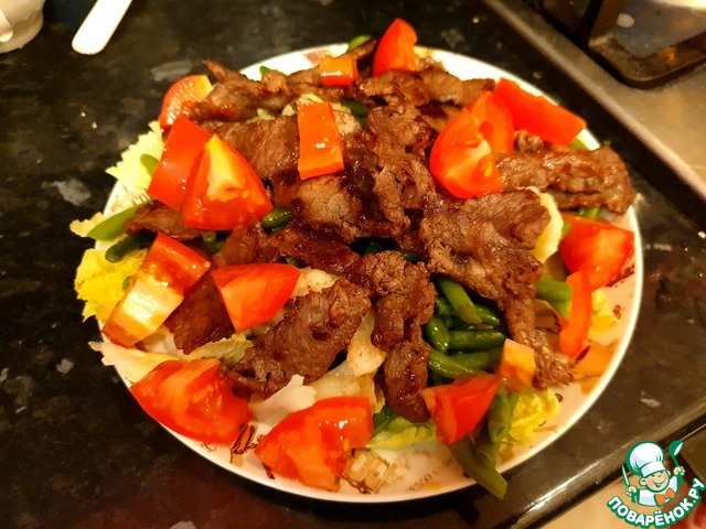 Мясо обжарить с небольшим количеством растительного масла в воке или на сковороде до готовности. Так как наши кусочки очень тонкие и пропитанные маринадом, это займет не более 10 минут.