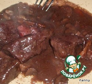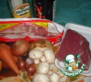 В гусятницу сложить на дно морковь, репчатый лук, сельдерей, дальше часть мяса, бекона, лука-шалот, чеснока, переслоить шампиньонами, затем оставшееся мясо и овощи. Добавить коньяк, соскрести прижарки со сковороды и - туда же. Хорошо посолить, положить перец горошком, специи, залить маринадом и добавить, при необходимости, еще вина.