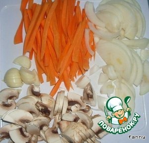 Морковь и сельдерей (у меня был корневой) - соломкой, лук репчатый и шалот - полукольцами, чеснок порубить не мелко.