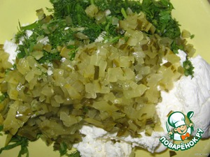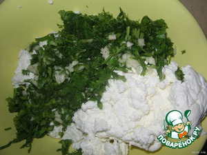 Нарезать мелко зелень, выдавить чеснок, добавить это всё к творогу. У меня был мелкозернистый творог. Если обычный, то его лучше протереть. Посыпать чёрным и красным острым перцем.