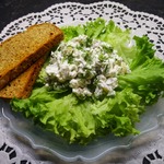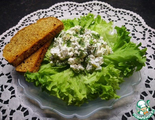 Творог с малосольным огурчиком, чесночком и зеленью. К завтраку - очень вкусно!