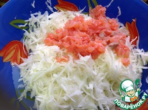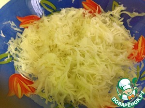 Шинкуем мелко и тонко капусту, обминаем ее руками и отправляем в салатницу