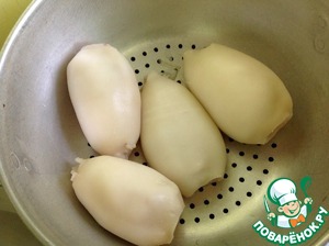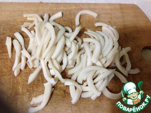 Воду ставим кипятить, подсаливаем и в кипящую воду бросаем замороженные очищенные кальмары. Варим с момента закипания 3 мин. и отбрасываем на дуршлаг