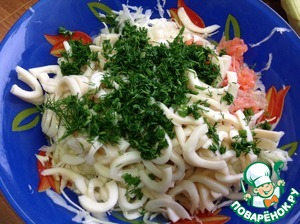 Очень вкусный, изысканный салатик. Легкий и быстрый в приготовлении. Приятно украсит праздничный и повседневный стол. Отличное сочетание кальмаров, семги и крабовых палочек со свежей капустой.