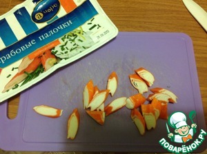 Крабовые палочки режем произвольно, чтобы украсить сверху салат