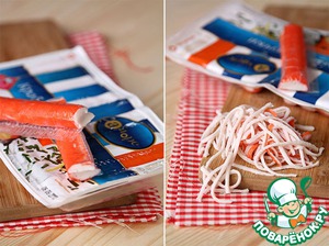 Основную часть крабовых палочек разберем на тонкие полосочки-волокна, а где-то 1/4 уберем в морозилку, лучше сделать это немного заранее.