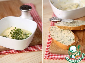 Перед тем, как приступить к приготовлению самого супа, включим духовку на 200-220 градусов и подготовим гренки. Для этого смешаем 125г сливочного масла комнатной температуры с нарезанной мятой и солью (по вкусу), хлеб нарежем ломтиками толщиной 1-1,5см и смажем получившимся мятным маслом.