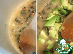 Теперь вольем воду, доведем до кипения, добавим авокадо и лимонный сок, накроем крышкой и поварим 3-5 минут, в зависимости от зрелости авокадо.