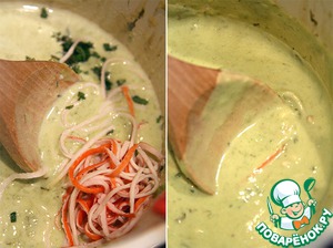 Суп раскладываем по подогретым тарелкам, посыпаем ЛЕДЯНОЙ крабовой "стружкой", украшаем листочками мяты...