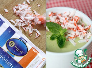Рецепт «Суп из авокадо с крабовыми палочками и мятными гренками»: