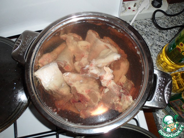 Заливаем мясо водой и ставим на огонь, снимаем пену, солим, закрываем крышку и варим на небольшом огне около 3 часов