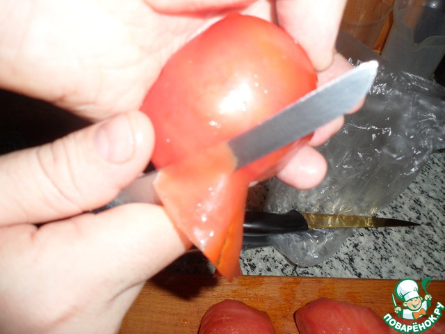 Чистим помидорки, мелко их режем. У нас остренькие ножи на кухне (Спасибо мужу!!) Поэтому я их не ошпариваю и чищу прямо так.