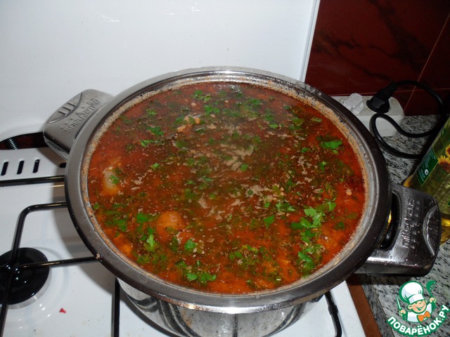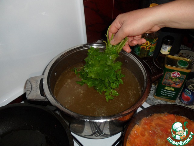 Сама так делала первый раз. Но так делала автор рецепта. Берем два пучка петрушки и кинзы и закладываем их в наш бульон на 15 минут, затем вынимаем и выбрасывем.