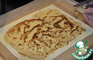 Испечь блины бездрожжевые (можно использовать готовые, имеющиеся в продаже). Мне потребовалось штук 10. -