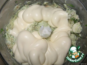 Измельчить в блендере колбасный сыр, кинзу, чеснок. Добавить майонез и чёрный перец.