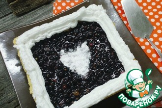 Достать из холодильника один квадрат застывшего теста. Развернуть пекарскую бумагу и присыпать ее мукой, раскатать тесто в пласт большего размера, чем форма, размер которой 28х22 см и высота 5 см, так, чтобы образовались бортики, и поместить на него еще горячий крем.